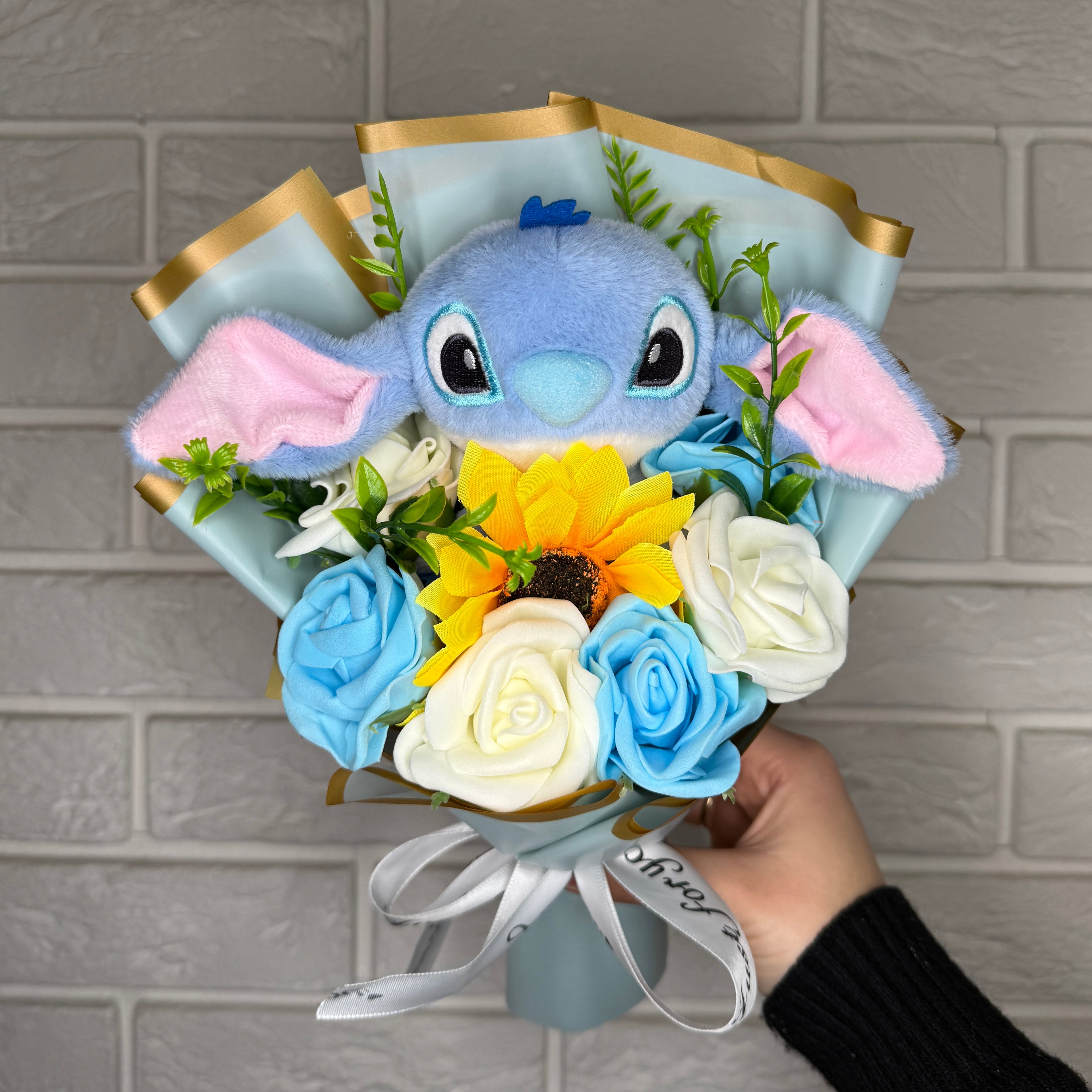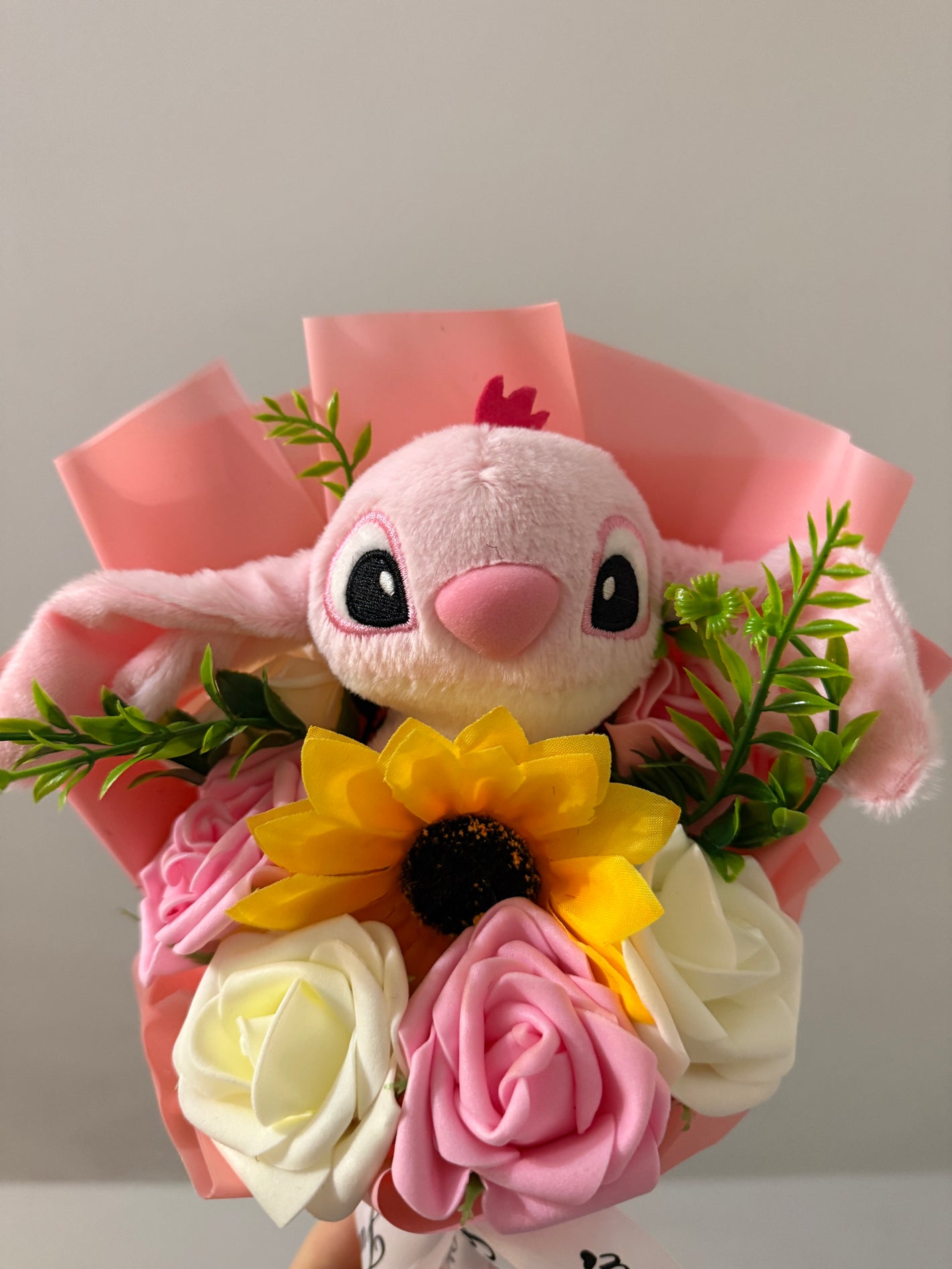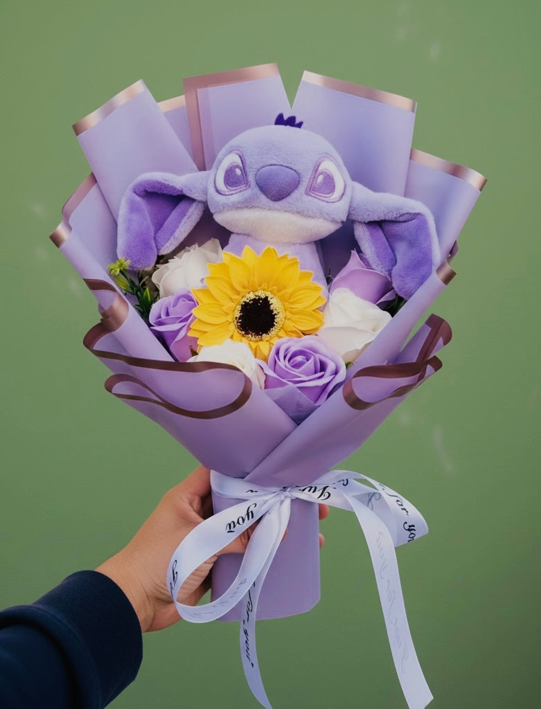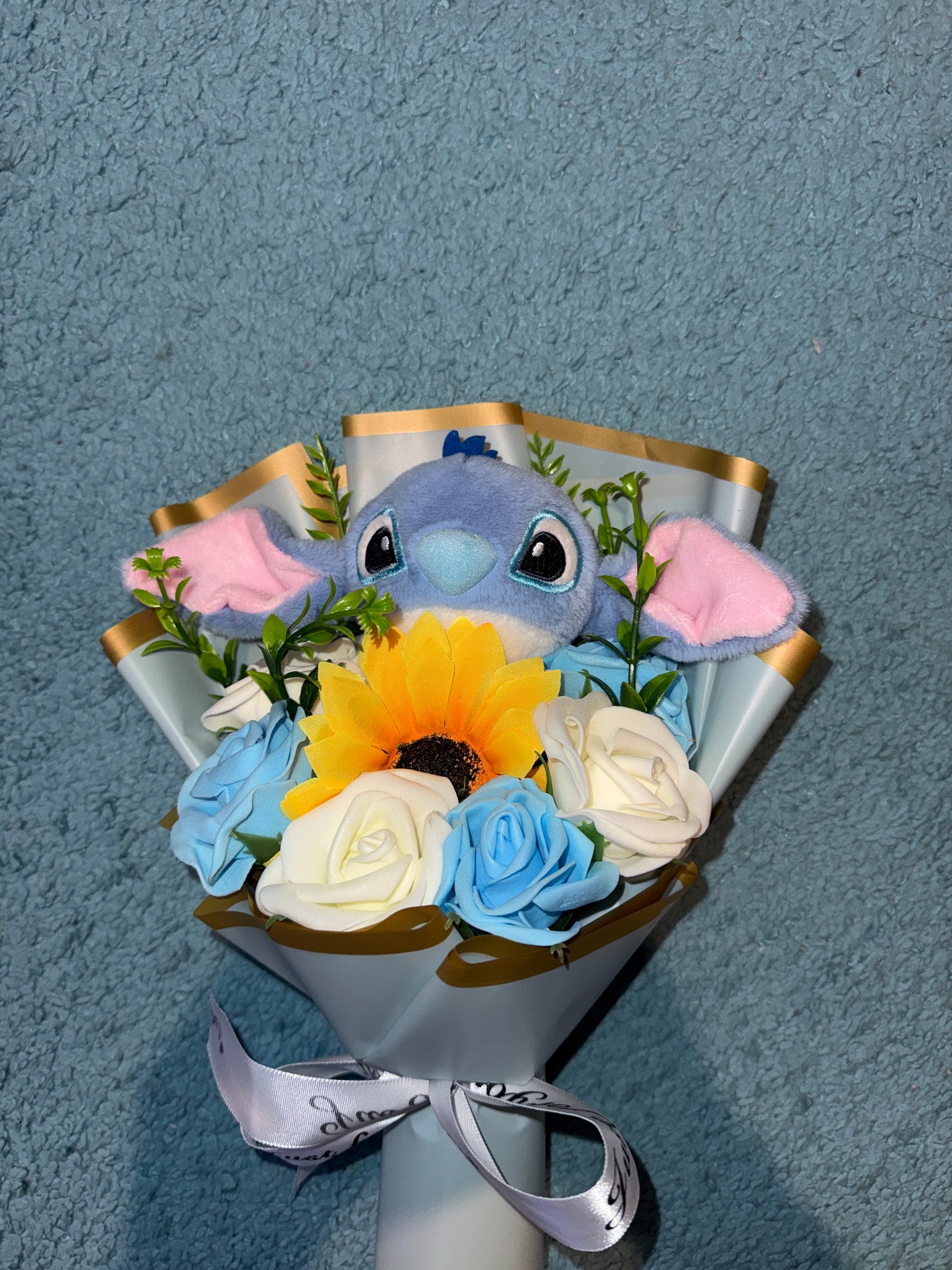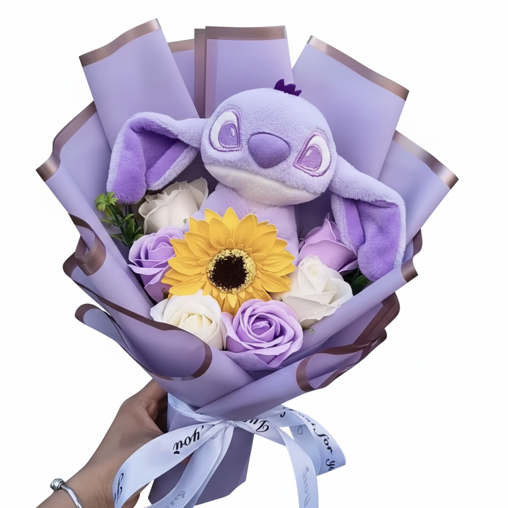 Wyjątkowy bukiet ze słonecznikiem, różami i uroczym pluszakiem. Bukiet dostępny w 3 wariantach 🩵🩷💜 kolorystycznych, idealnych do wyboru na każdą okazję.